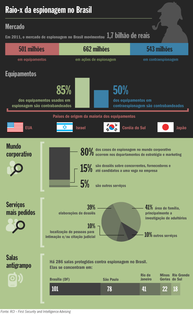 A Veja cita uma pesquisa da consultoria RCI - First Security and Intelligence Advising, que estima que o mercado de espionagem no Brasil tenha movimentado cerca de 1,7 bilhão de reais em 2011, incluindo serviços de empresas e de profissionais autônomos (os detetives particulares), formais ou não, e investimentos em equipamentos de espionagem e de contraespionagem. A pesquisa também estima que as empresas perdem com espionagem no Brasil entre 1 bilhão e 1,5 bilhão de reais