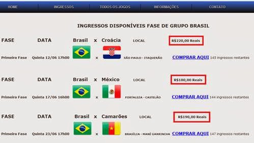 O site oferece os supostos ingressos para jogos do Brasil pelo valor de 180 reais.